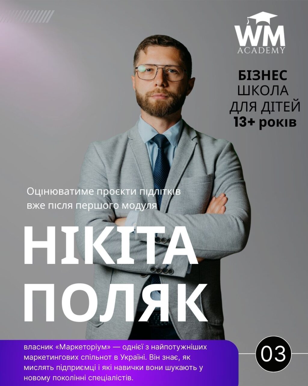 Наші учні захищатимуть свої перші проєкти, і серед тих, хто оцінюватиме їхні роботи, буде Нікіта Поляк — власник Маркеторіуму, найбільшої маркетингової спільноти в Україні.